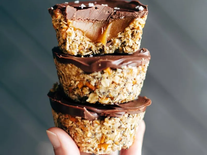 These no-bake salted caramel cups deliver indulgent sweetness without turning on the oven. A nutty, textured oat-pecan-pretzel crust forms the base, filled with rich caramel and topped with melted chocolate and a hit of fleur de sel. The combination of salty-sweet layers, creamy caramel center, and satisfying crunch makes them feel like a gourmet treat, but they come together in minutes. Perfect for anyone seeking quick desserts or gifts, these cups work year-round but shine during warmer months when baking feels unnecessary. This version builds complexity through ingredient texture contrast—the pretzel adds savory crunch, dates provide natural sweetness and binding, and coconut oil creates tender structure. Unlike typical candy cups that rely on butter-based crusts, this recipe celebrates whole grains and nuts, making it more approachable for varied diets while delivering restaurant-quality flavor.