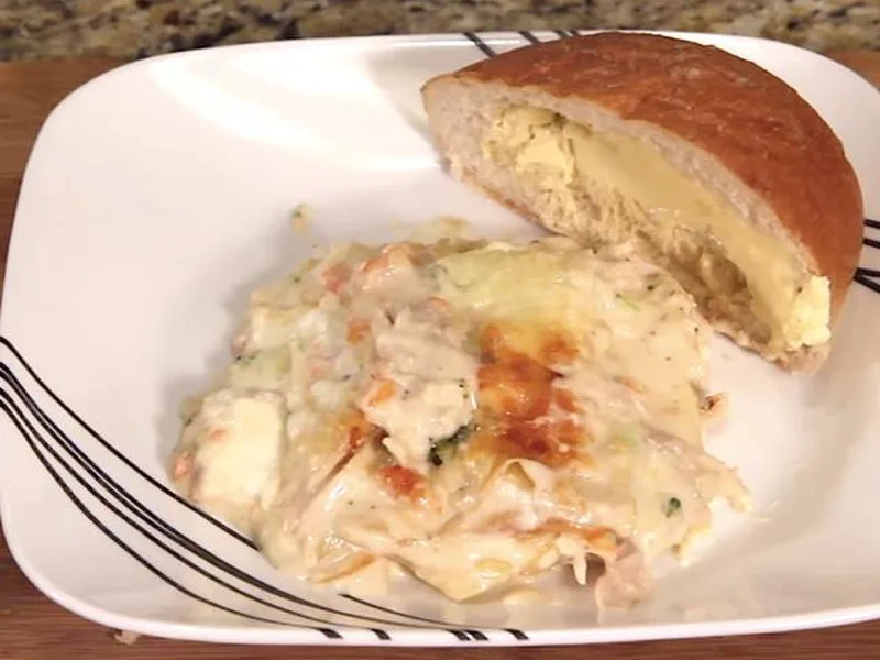 No-Boil Alfredo Chicken Lasagna with Roasted Garlic Bread