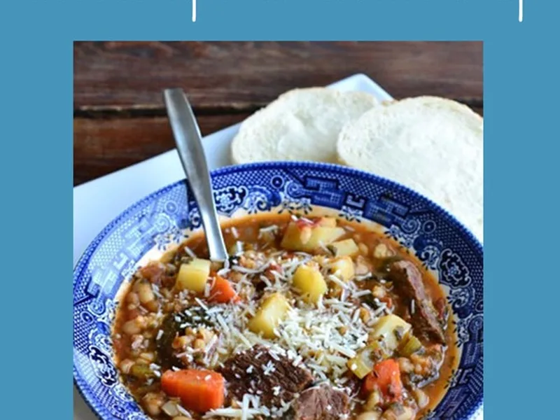Rustic minestrone loaded with beef chuck, bacon, barley, and vegetables simmered in beef broth. Thickened with mashed beans and finished with fresh spinach, herbs, and parmesan. A substantial one-pot soup that feeds a crowd.