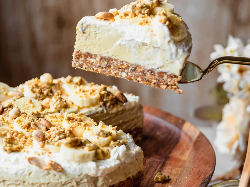 No-bake vegan cake featuring a chunky peanut, almond and oat base topped with silky banana mousse made from aquafaba. Finished with whipped coconut cream, sliced banana, and crunchy nut topping. Naturally sweetened with maple syrup and honey, this freezer cake delivers tropical flavors with satisfying texture contrast.