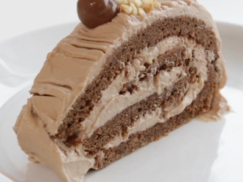 Soft chocolate sponge cake soaked with sugar syrup, filled and frosted with whipped Nutella mascarpone cream, rolled into a log, and topped with hazelnuts. A festive dessert combining light sponge texture with rich hazelnut-chocolate flavors.