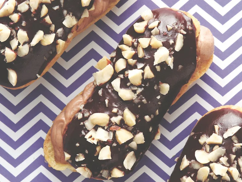 Sprinkle chopped hazelnuts over éclairs while glaze is still soft.