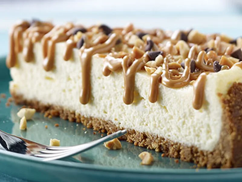 Warm remaining peanut butter and drizzle over the cheesecake just before serving.