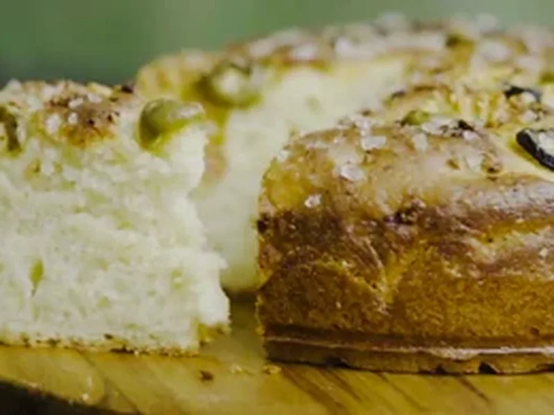 Soft, airy bread studded with brined olives, fresh garlic, and peri peri spice. The dough comes together with warm water and active yeast, then rises twice before baking until golden. Top with flaky sea salt for finishing.