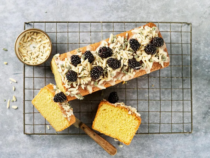 A sophisticated European-style olive oil cake that marries fruity, peppery notes with delicate almond sweetness and unexpected herbal warmth. Ground almonds and durum wheat semolina create a tender, moist crumb that stays fresh for days, while candied thyme-crusted almonds and fresh blackberries top a tangy lemon glaze. The olive oil replaces butter entirely, yielding a lighter, more vibrant cake with subtle complexity. This version balances savory thyme throughout—both in the batter and as a crunchy garnish—setting it apart from traditional almond cakes. Perfect for afternoon tea, dessert after dinner, or a showstopping centerpiece for a casual gathering. It suits confident bakers wanting to move beyond vanilla-forward cakes into more nuanced, ingredient-forward territory.