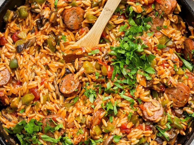 A streamlined skillet dinner combining tender orzo pasta with seasoned chicken sausage, earthy mushrooms, and bell peppers in a tomato-based broth. The one-pan approach minimizes cleanup while building flavor through toasting the pasta and layering aromatics. Perfect for weeknight dinners when you need satisfying, complete-meal comfort in under 30 minutes. This version forgoes cream or cheese, letting the sausage, fresh vegetables, and tomato broth shine.