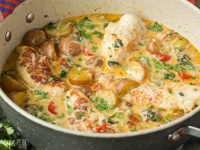 Tuscan-inspired one-pan chicken and potatoes finished with a silky cream sauce infused with garlic, tomatoes, and spinach. Italian herbs and melted parmesan bring warmth and richness to tender chicken breasts and potatoes cooked together. Serve this weeknight-friendly skillet for family dinners or casual entertaining. This version combines the speed of pan-searing with gentle simmering, letting flavors meld while keeping cleanup minimal.