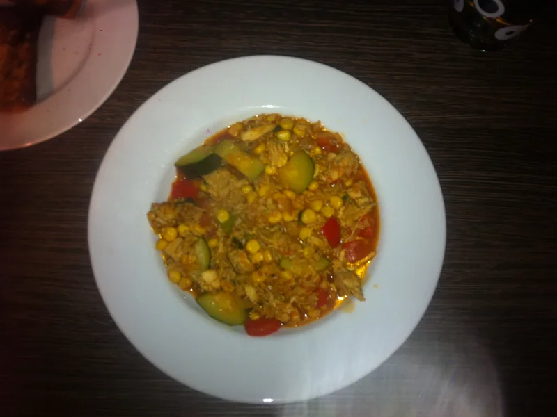 A straightforward one-pot casserole combining seasoned chicken thighs, instant brown rice, and fresh zucchini in a savory broth base with salsa. The chicken browns first to develop flavor, then everything simmers together until the rice absorbs the liquid and zucchini becomes tender. Quick weeknight dinner for families seeking a complete, lightly spiced meal with fresh vegetables and lean protein. This version uses instant pre-cooked brown rice to reduce cooking time compared to traditional brown rice methods.