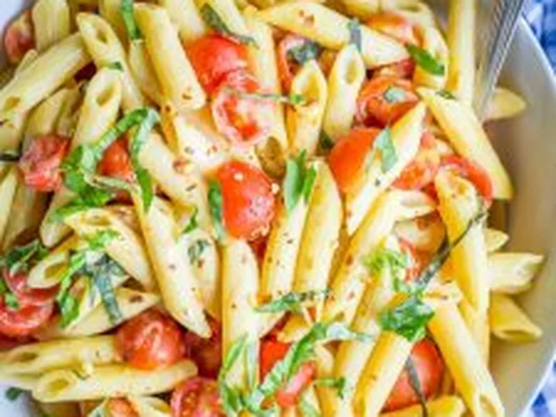 Dairy-free pasta cooked directly in a blend of water and plant-based milk, finished with nutritional yeast for a rich, creamy sauce. Cherry tomatoes, fresh basil, and garlic create a bright Caprese twist on this quick weeknight meal. Ready in 30 minutes with minimal cleanup.