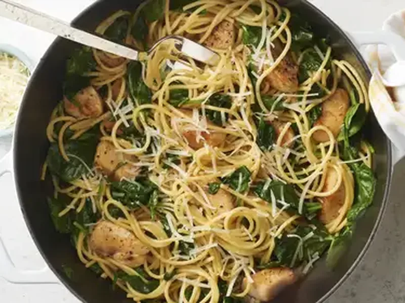 A complete meal that comes together in a single Dutch oven, combining tender chicken seasoned with lemon pepper, al dente spaghetti, and fresh baby spinach in a rich chicken broth base. The pasta absorbs the savory broth while cooking, creating a cohesive dish with bright lemon flavor from fresh juice and zest. Parmesan cheese and butter add richness, while the spinach wilts into the warm pasta for added nutrition. Perfect for busy weeknights when you want a satisfying dinner with minimal cleanup.