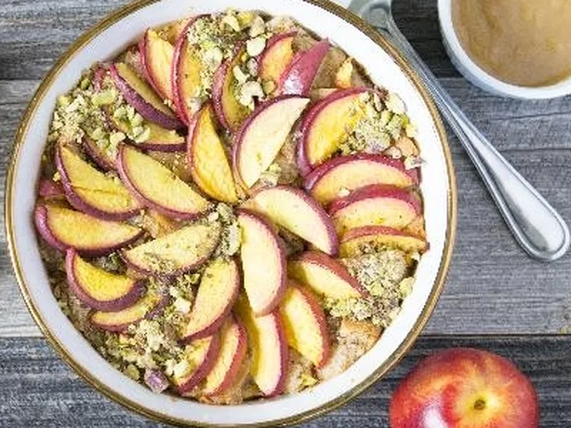 Custard-based bread pudding with fresh Ontario nectarines and chopped pistachios, baked until set and served with caramel sauce. The fruit arranges in a decorative pattern on top, while warm caramel made with brown sugar, butter, and cream complements the spiced bread base.