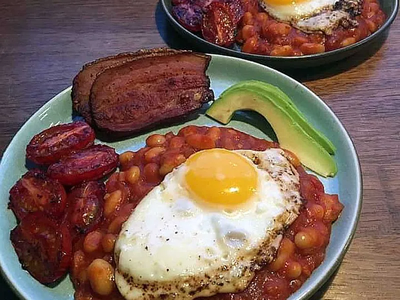 Dutch-style baked beans made from dried white beans soaked overnight, then simmered with sautéed onions, garlic, paprika, cumin, and tomatoes in a rich tomato and brown sugar sauce. The beans cook low and slow until tender and the sauce thickens, creating a deeply flavored side dish. Optional cornstarch slurry can be used to achieve desired consistency.