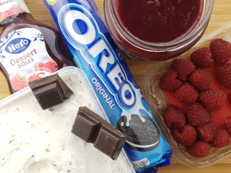 No-bake layered dessert featuring crushed Oreos, creamy stracciatella ice cream, fruit jam, and whipped cream. Quick assembly in serving glasses with Oreo crumble base, alternating ice cream and jam layers, finished with whipped cream, chocolate, and fresh fruit garnish.