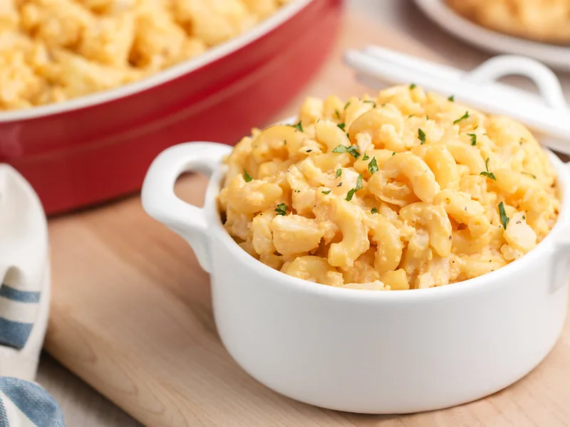 Lightened mac and cheese combining tender cauliflower with whole-wheat elbow pasta in a creamy cheddar sauce made from cream cheese, cheddar powder, sour cream, and butter. Ready in under 15 minutes, this veggie-packed version delivers classic comfort with added fiber and reduced fat.