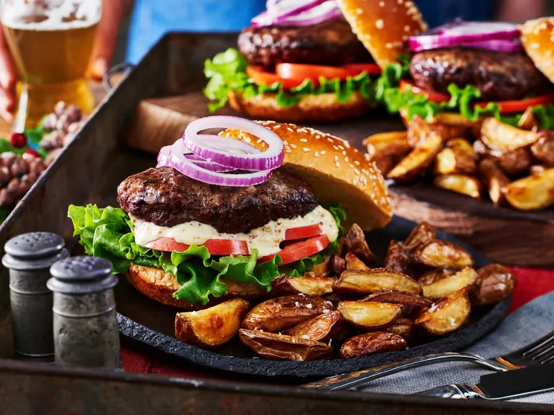 Serve burgers on toasted buns with standard toppings. Potatoes work as a side or can be served as finger food.