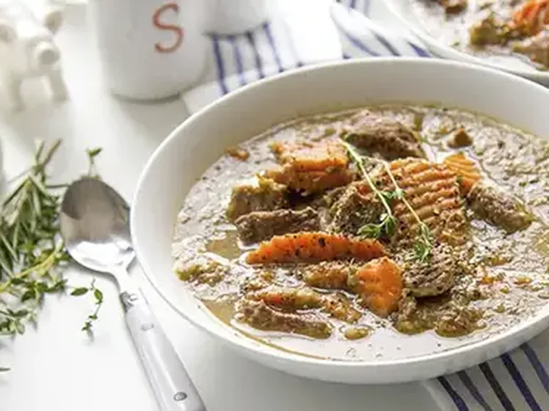 A rich, grain-free beef stew featuring tender grassfed meat in a smooth mushroom-vegetable base. The secret lies in pureeing sautéed onions, mushrooms, and celery with broth to create a naturally thick, velvety foundation without flour or starches. Fennel seeds add subtle warmth while fresh herbs brighten each spoonful. Perfect for cold evenings or anyone following paleo eating patterns, this hearty stew proves comfort food doesn't require grains or dairy.
