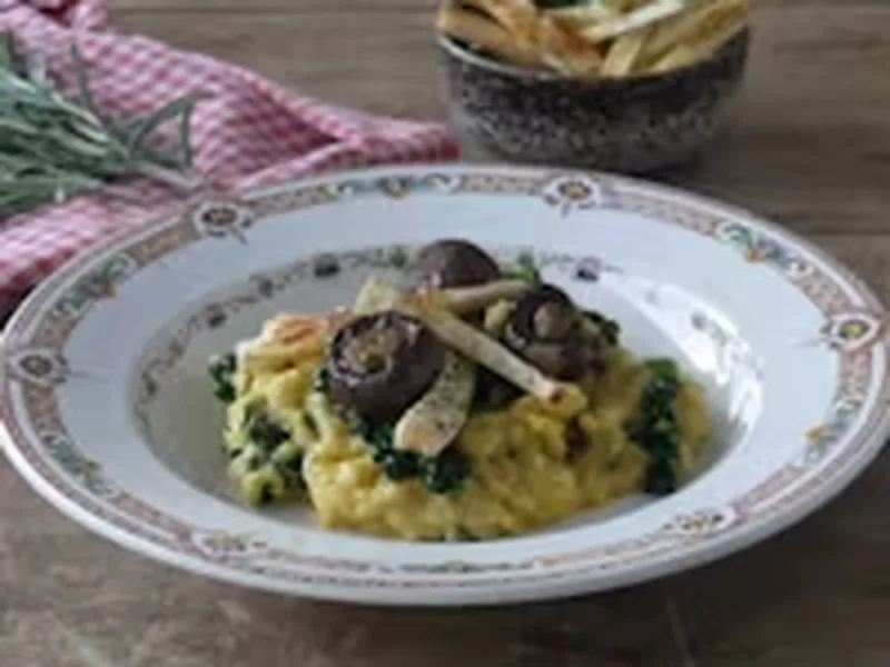A sophisticated vegetarian main that layers creamy polenta infused with rosemary and sauteed palm kale, topped with roasted spiced mushrooms and crispy parsnip fries. The dish balances earthy polenta with bright herbal notes from basil dressing and woodsy mushroom depth. What makes it special is the textural contrast—creamy polenta against crispy fries and tender mushrooms—plus the vibrant basil-garlic emulsion that ties everything together. The spiced element comes from optional Tabasco and soy sauce, adding umami complexity. This is for cooks comfortable with multiple simultaneous components and looking to impress at dinner parties. Serve as a vegetarian main course or elegant side dish for special occasions. This version stands apart through its integration of palm kale, a nutrient-dense alternative to spinach, and the methodical layering of flavors and textures that creates restaurant-quality presentation on the plate.