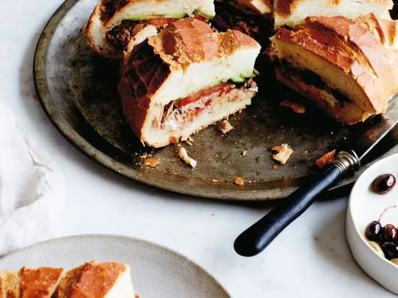 Make this sandwich 4-8 hours ahead; the resting period is essential, not optional. Flavors deepen and meld as the bread absorbs the dressing and fillings.