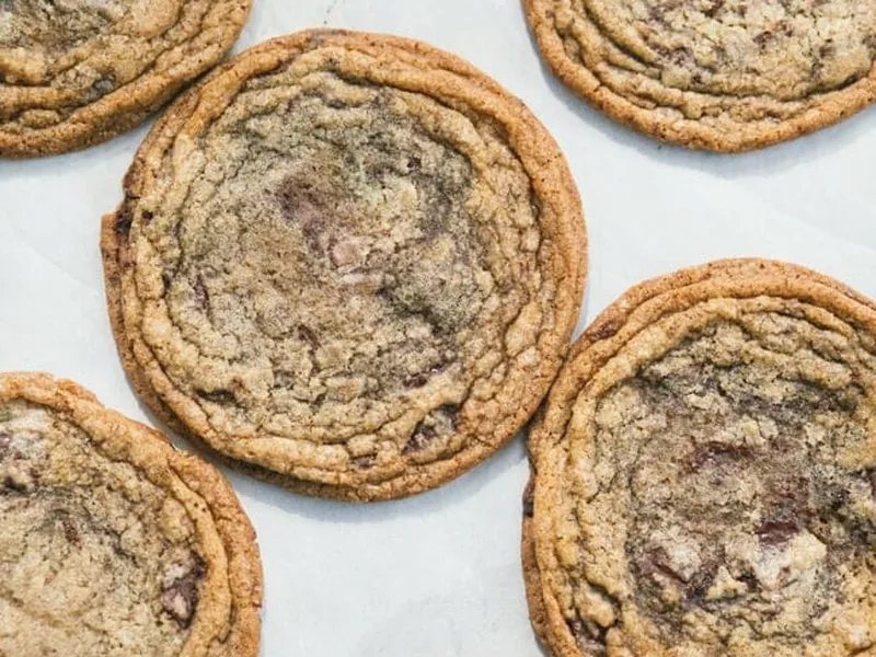 Thick, chewy cookies with espresso depth and chocolate chunks, baked using a pan-banging technique that creates ridged edges and underbaked centers. Molasses adds subtle sweetness and moisture. The method—lifting and dropping the baking sheet repeatedly—produces distinctive texture contrast: crispy, golden edges with soft, fudgy middles.