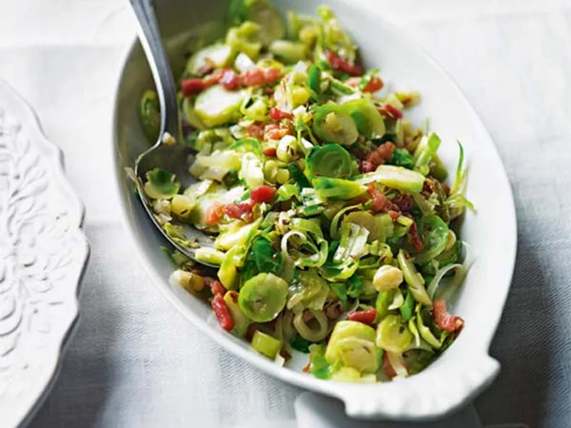 Prepare ingredients (slice sprouts, leek, chop hazelnuts) up to 1 day ahead. Cook just before serving for best texture and bacon crispness.