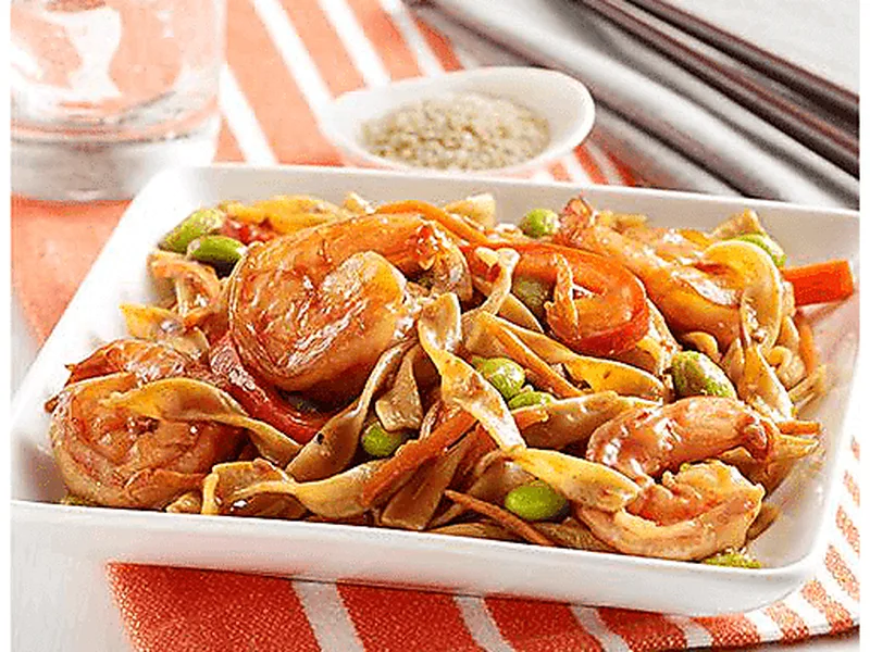 Crispy pan fried egg noodles tossed with succulent shrimp, shredded carrot, red bell pepper, and edamame in a savory teriyaki sauce. Quick weeknight stir fry that delivers tender-crisp vegetables and golden noodles in under 30 minutes.