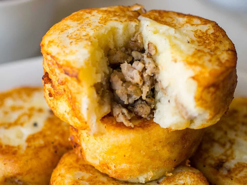 Shape a golf ball-sized handful of potato into a flat pancake. Place 1 tablespoon sausage in the center, top with another potato pancake, and seal the edges. Shape into a hockey puck.