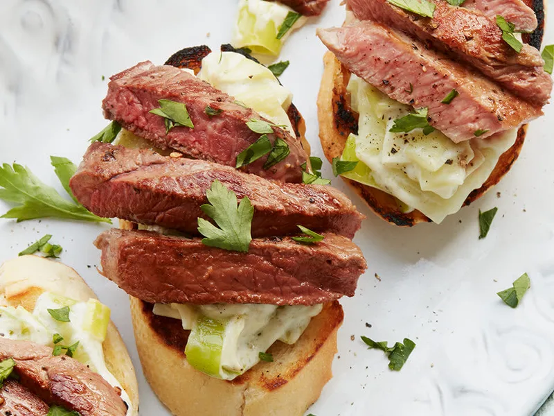 Prepare the leek compote and slice the lamb up to six hours ahead, refrigerated. Toast bread and rub with garlic two hours before serving. Assemble only when ready to serve to prevent bread from absorbing moisture and becoming soggy.