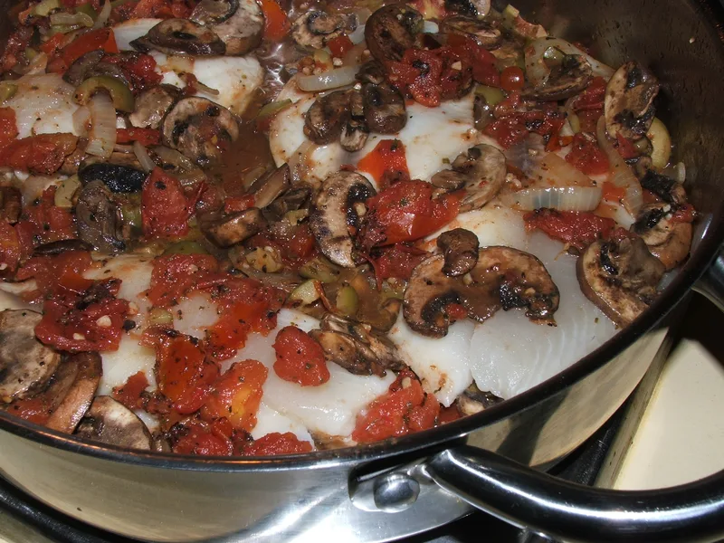 A bright, skillet-cooked tilapia dish where delicate white fish is gently poached in a vibrant tomato-olive sauce. The pimiento-stuffed green olives provide briny pops and slight sweetness, while cremini mushrooms add earthiness and body. Fresh garlic and dried oregano anchor the Mediterranean flavor profile with warmth. This is an easy weeknight dinner for home cooks seeking restaurant-quality results without fuss. The method—building the sauce first, then nestling the fish directly in the pan—keeps everything in one vessel and ensures moist, flaky fillets. Serve over pasta, rice, or crusty bread to catch every drop of sauce. The fire-roasted tomatoes the base, lending subtle smokiness that distinguishes this from standard tomato-based fish preparations.