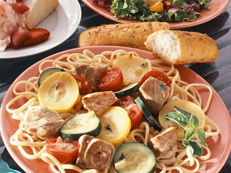 Vegetables can be prepped earlier in day. Cook tuna and pasta just before serving.