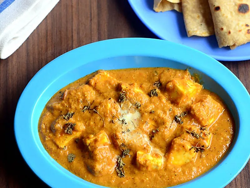 Creamy tomato and cashew gravy with soft paneer cheese and aromatic spices. Blanched tomatoes and ginger-garlic paste form the base, balanced with garam masala and finished with fresh cream and dried fenugreek for depth. The gravy develops a rich orange hue as milk and spices meld together.