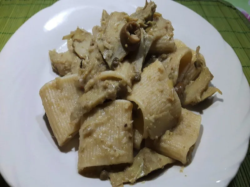 Sicilian-style pasta with tender artichoke hearts, briny olives, salt-cured anchovies, and capers. Artichokes are meticulously trimmed and braised in olive oil with garlic and white wine until silky, then tossed with al dente paccheri and finished with pasta water for a silky sauce.