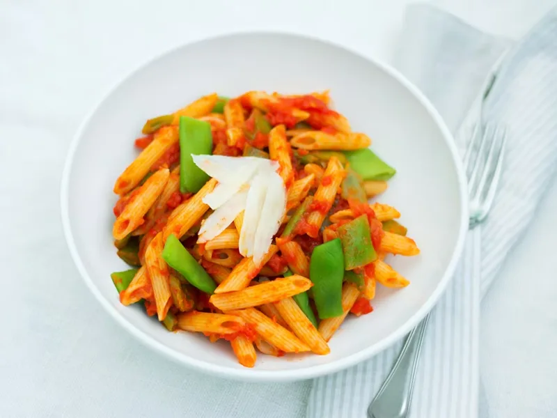 Italian pasta dish combining blanched sugar snap peas with a light tomato sauce flavored with shallot and olive oil. Tossed with mezze rigatoni or maltagliati and finished with shavings of aged ricotta salata or pecorino cheese. Quick, vegetarian, and seasonal.