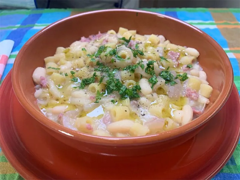 Traditional Italian pasta and bean soup enriched with pork rind and salami paste. Cannellini beans simmered with ditaloni pasta, braised pork skin, and salami in a vegetable broth base, finished with fresh parsley and olive oil. A rustic, protein-rich comfort dish.
