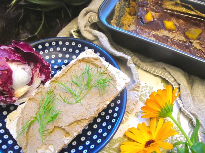 A smooth, savory paste made from sautéed chicken livers and roasted pumpkin, balanced with balsamic vinegar. The livers cook until no longer pink inside, then everything is blended into a fine spread perfect for toast or crackers. Season to taste with salt, pepper, and additional vinegar.