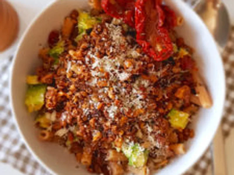 Chickpea pasta tossed with a roasted walnut-pecan crumble made from sun-dried tomatoes, shallots, and garlic, finished with fresh avocado, sun-dried tomato oil, and Grana Padano. The nut mixture offers a hearty texture and savory depth while the avocado provides creamy richness.