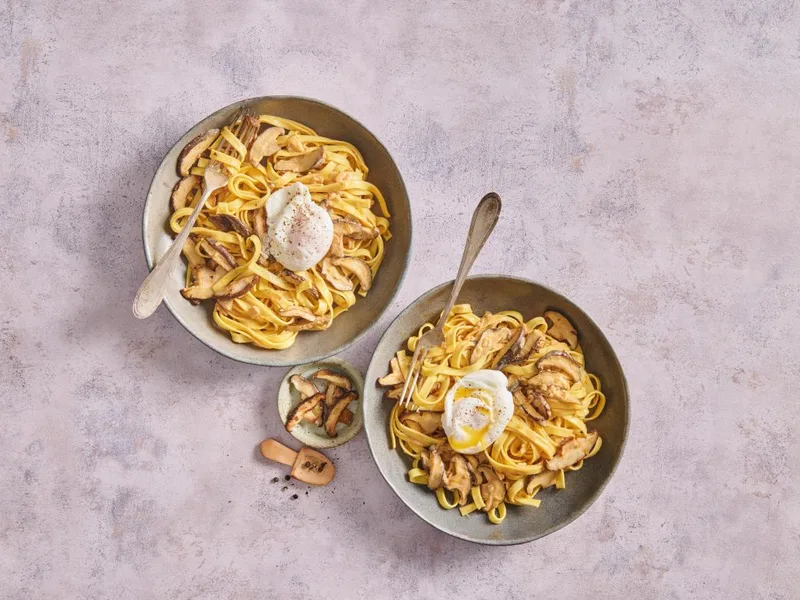 German-style pasta dish combining earthy shiitake mushrooms in a creamy ragout with poached eggs. Mushrooms and onions are sautéed with paprika, then finished with crème fraîche and pasta cooking water. Soft poached eggs top each serving for richness and texture contrast.