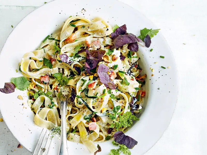 Prepare ingredients up to 4 hours ahead: chop bacon and herbs, peel courgette ribbons (store in paper towels to absorb excess moisture), measure cream and stock. Cook pasta fresh just before serving.