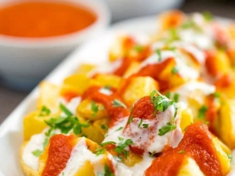Spanish fried potato cubes with two sauces: a spiced tomato salsa bravas and garlic aioli. Potatoes are parboiled, air-fried until crispy, then topped or served alongside the quick-simmered tomato sauce with smoked paprika and hot sauce, plus creamy garlic mayonnaise.