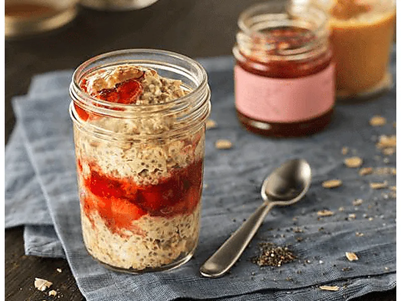 No-cook overnight oats layered with creamy peanut butter, fresh strawberries, and jam. Mixed with chia seeds and almond milk, these make-ahead jars require just refrigeration overnight. Serve chilled with extra peanut butter and jam on top for a quick breakfast.