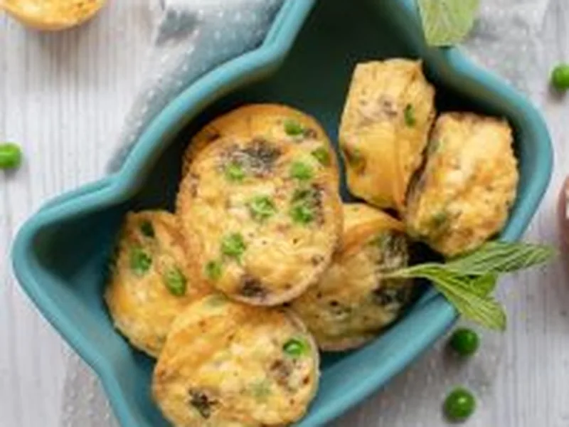 Individual baked frittatas combining eggs, frozen peas, crumbled feta, and fresh mint, portioned in a muffin tin. Quick, protein-rich appetizers or light meal option that bake until set and golden.