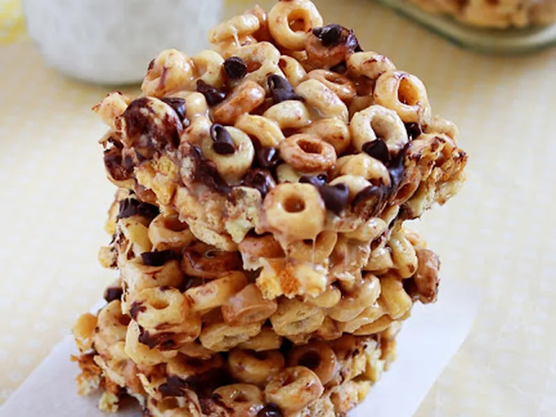 A no-bake cereal bar that combines the nutty richness of peanut butter with marshmallow sweetness and crunchy Cheerios. These treats deliver a textured bite with chewy marshmallow, toasted cereal crunch, and melted chocolate throughout. The combination of peanut butter and chocolate creates a classic flavor profile that appeals to both kids and adults. Make these for lunch boxes, school bake sales, or quick weeknight desserts when you need something fast and satisfying. This version stands apart by using Multigrain Cheerios instead of plain Rice Krispies, adding whole grain texture and subtle oat flavor, while the peanut butter component deepens the taste beyond standard marshmallow treats. The chocolate chips provide pockets of richness without overwhelming the other flavors.