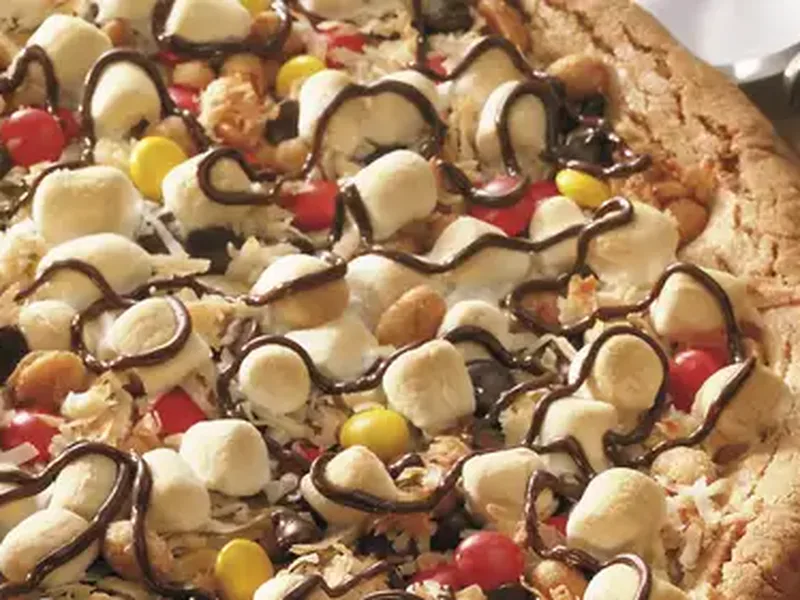 A fun dessert pizza made from peanut butter cookie dough topped with colorful candies, marshmallows, and melted chocolate. Perfect for kids' parties, Halloween gatherings, or any celebration where you want something playful and sweet. The cookie base stays chewy while the toppings add varied textures and flavors. This recipe transforms a simple cookie mix into an impressive sharing dessert that looks like pizza but tastes like your favorite candy store treats.