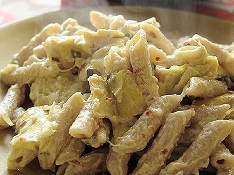 A creamy Italian-American pasta featuring pan-seared chicken tenders with garlic, green onions, and artichoke hearts in a white wine and cream sauce, finished with romano cheese. Originating from Buca di Beppo's menu, this restaurant favorite combines bright citrus notes from white wine with earthy artichokes and a silky cream finish. Serve as a comforting weeknight dinner or special occasion pasta that feels restaurant-quality at home. The key distinguishing feature is the combination of artichokes and cream with just enough red pepper heat to keep the palate engaged.