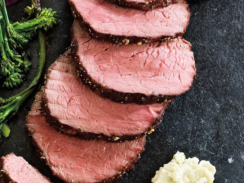 Peppered Top Sirloin Roast with Blue Cheese Broccolini