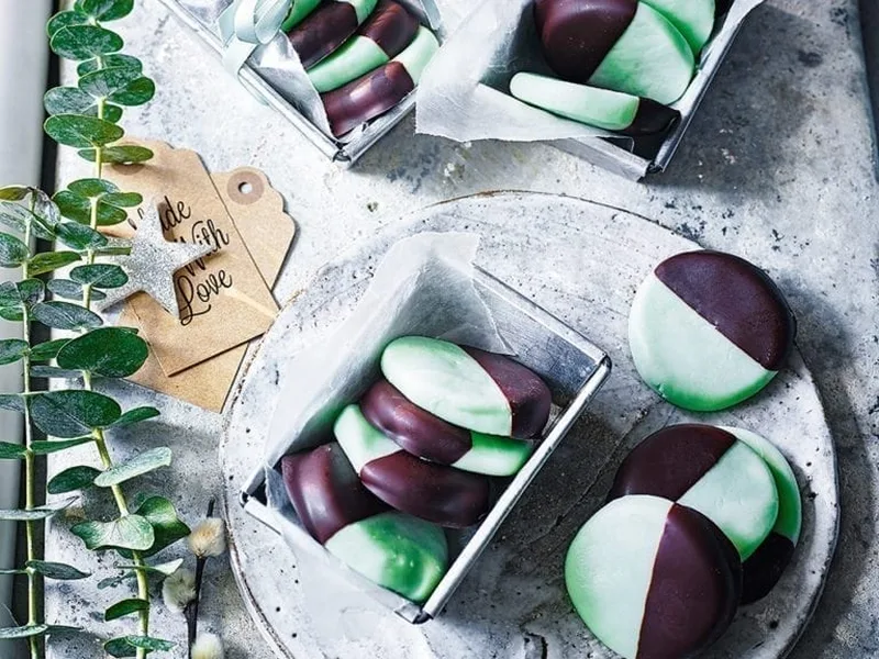 Creamy peppermint fondant centers dipped in dark chocolate, ideal for Christmas gifting. Fresh lemon juice and peppermint extract create bright flavor, while hand-kneading develops the signature smooth, firm texture. Yields 35-40 pieces that keep well refrigerated for weeks.