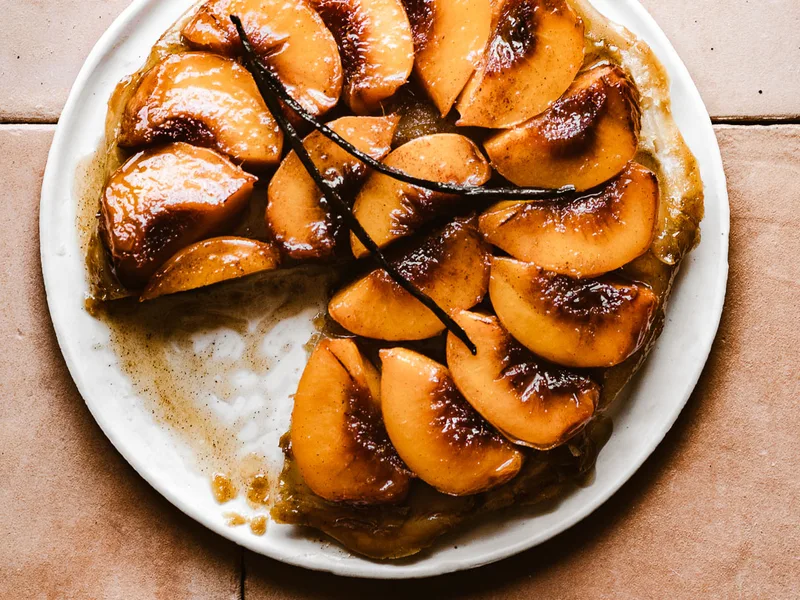 Buttery caramelized peaches arranged in a skillet with warm spices, topped with puff pastry and baked until golden. The tart is inverted to reveal glossy amber caramel and tender fruit. Serve warm with vanilla ice cream.
