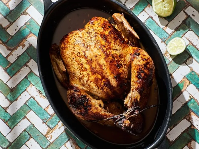 A whole roasted chicken marinated in cumin, garlic, and aji amarillo paste, then roasted until golden and served with a bright cilantro-based aji verde sauce. This version balances traditional Peruvian spices with yogurt-based sauce for a tangy, herbaceous finish. Serve for weeknight dinners or casual entertaining. The marinade develops deep flavor while the aji verde provides a cooling counterpoint to the savory bird.