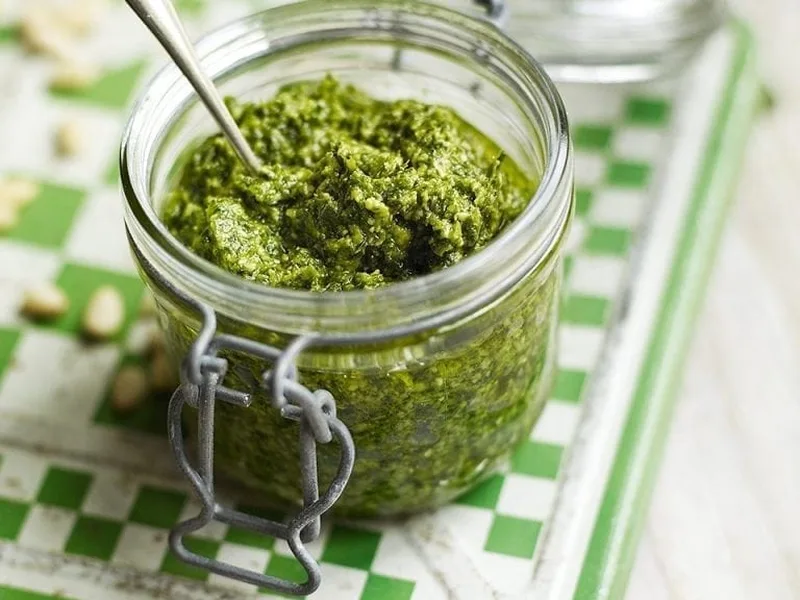 Skip the olive oil seal when storing to avoid pesto oxidizing and turning dark brown in the fridge