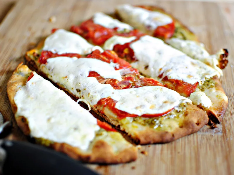 Quick personal pizzas made on naan bread, topped with basil pesto, fresh tomato slices, and melted mozzarella. Baked until the cheese is bubbly and the crust turns golden and crispy. Ready in under 15 minutes for an easy weeknight meal or appetizer.