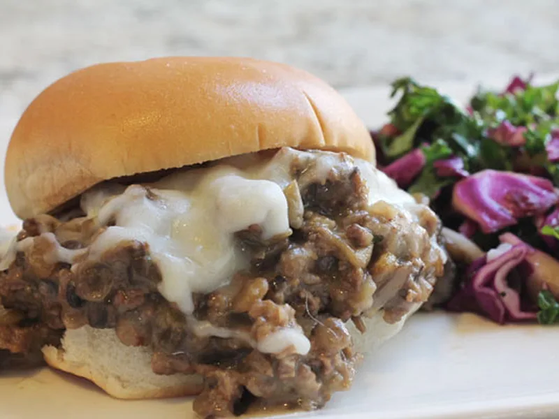 Hearty sloppy joes inspired by Philly cheesesteaks, combining ground beef, sautéed mushrooms and onions, green lentils, and melted provolone cheese. Beef broth and Worcestershire sauce create a savory base that simmers briefly before serving on slider buns topped with additional cheese.